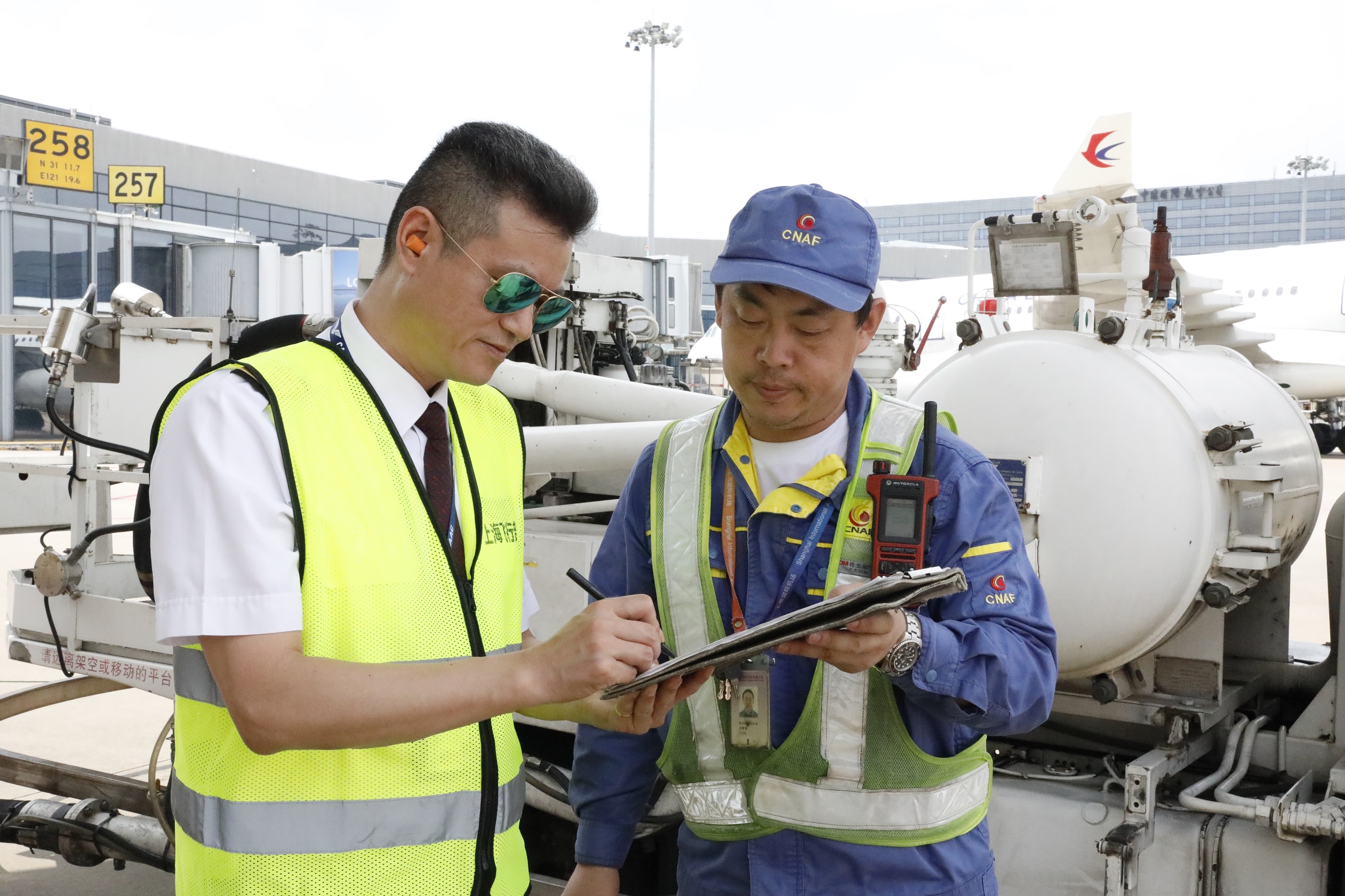 東航A350機(jī)長(zhǎng)季紅華與機(jī)場(chǎng)工作人員進(jìn)行工作交接