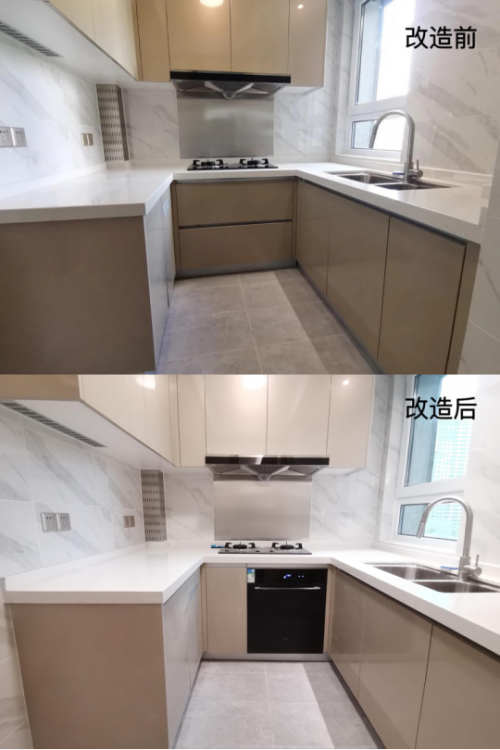 老板電器“無憂廚改”項目洗碗機(jī)改造效果,(上)改造前,(下)改造后