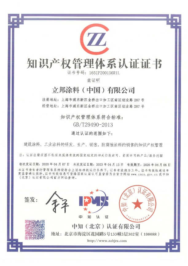 立邦再獲《知識產(chǎn)權(quán)管理體系認證證書》
