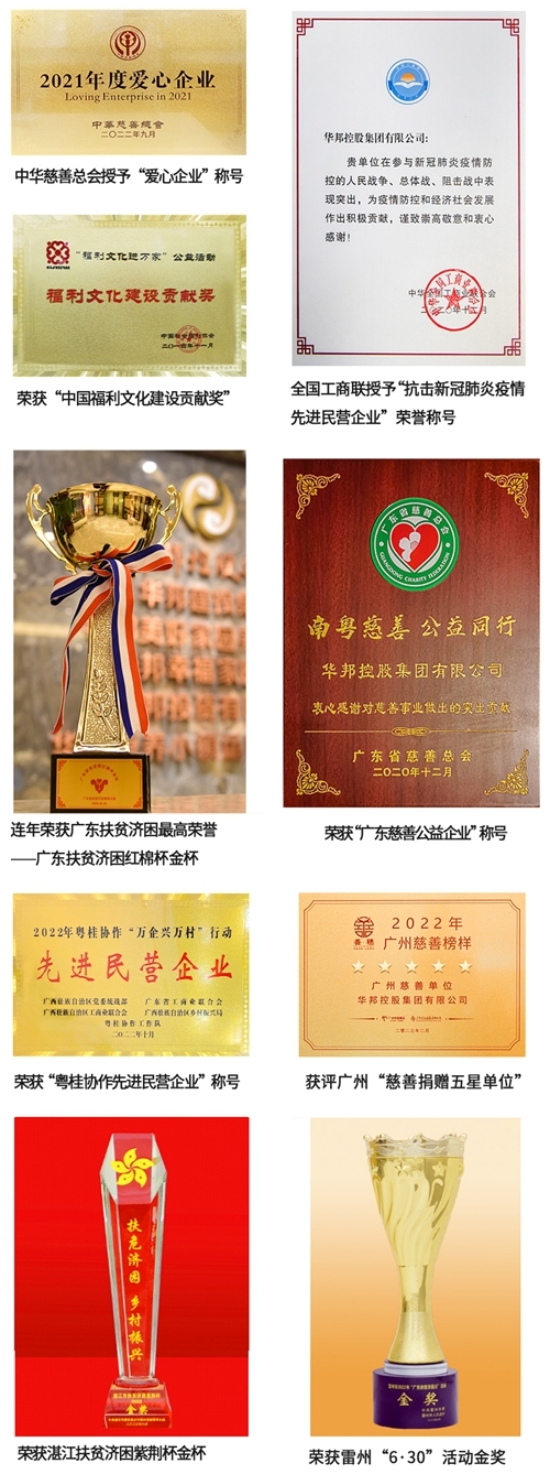 永葆初心,載譽前行。華邦控股集團自成立以來,將社會責任提高到自身發(fā)展的戰(zhàn)略高度,積極回報社會,持續(xù)增進民生福祉,愛心善舉獲得社會各界的肯定和贊譽,慈善影響力與日俱增:榮獲中華慈善總會愛心企業(yè)、全國抗擊新冠肺炎疫情先進民營企業(yè)、中國福利文化建設(shè)貢獻獎、粵桂協(xié)作先進民營企業(yè)、廣東扶貧濟困紅棉杯金杯、廣東百佳愛心幫扶企業(yè)、湛江市紫荊杯金杯、雷州市扶貧濟困日活動金獎等榮譽,獲評廣州最具影響力慈善企業(yè)、廣州慈善企業(yè)榜樣、慈善捐贈五星單位。