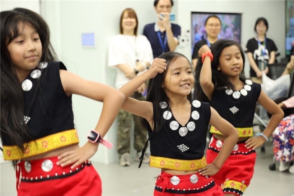 在后續(xù)的活動中,孩子們向企業(yè)志愿者們展示了他們各民族的才藝。來自佤族的孩子向志愿者們展現(xiàn)了傳統(tǒng)的甩發(fā)舞,佤族人民以長發(fā)為美,佤族姑娘們伴隨著鼓點鮮明的音樂,甩動起來的長發(fā)就像飄著的一塊塊黑綢緞,飄逸大氣,野性十足,自信展現(xiàn)著本民族獨特的文化魅力。來自納西族的孩子們帶著志愿者認識他們的傳統(tǒng)文字——東巴文,這是世界上唯一一種還在使用的象形文字,距今已有1200多年的歷史。志愿者們借助形象的圖像表達認識了東巴文中的十二生肖動物文字,并和孩子們一起體驗“東巴十二生肖”桌游,在充滿民族文化內(nèi)涵的益智游戲中,沉浸式感受納西族的智慧。各族青少年和企業(yè)志愿者們玩鬧在一起,活動會場內(nèi)回蕩著大家的歌聲、笑聲。