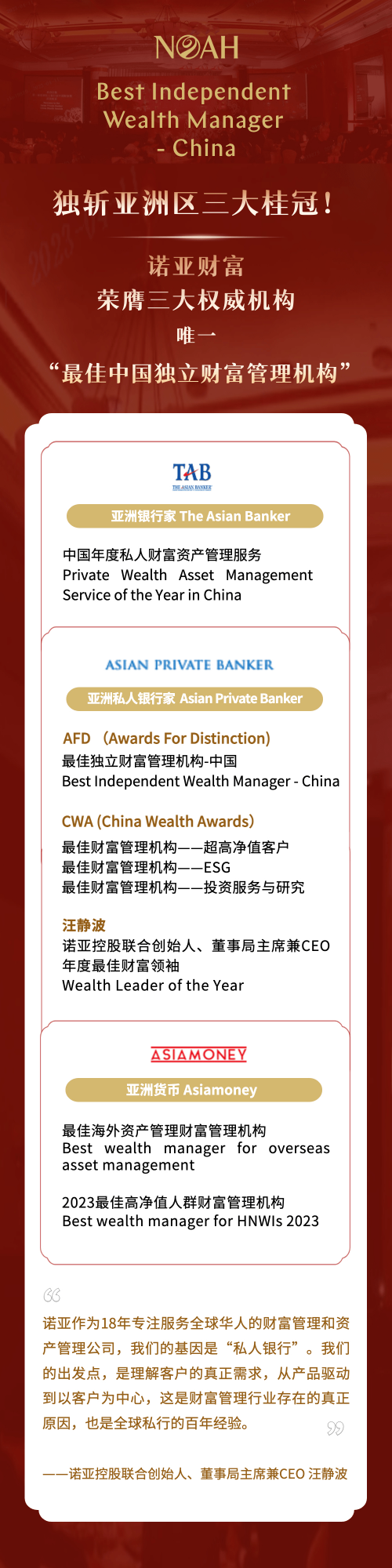 3月27日,諾亞財富在第五屆《亞洲私人銀行家》(Asian Private Banker)中國財富獎(China Wealth Awards)評選中斬獲四大榮譽(yù)的優(yōu)異成績,在“超高凈值客戶”、“ESG”、“投資服務(wù)與研究”和“年度最佳財富領(lǐng)袖”個人成就獲得權(quán)威認(rèn)可。在此前的3月8日,諾亞亦作為中國區(qū)唯一獲獎財富管理公司榮獲《亞洲私人銀行家》亞洲區(qū)“2022中國最佳獨(dú)立財富管理機(jī)構(gòu)”,受邀與法國巴黎銀行、摩根私人銀行、匯豐銀行、花旗銀行、瑞士信貸銀行、澳大利亞國民銀行、國泰世華等國際私人銀行及財富管理標(biāo)桿一同出席于中國香港舉辦的盛典,也是諾亞財富第六年獲得亞洲私人銀行家的多項(xiàng)認(rèn)可。