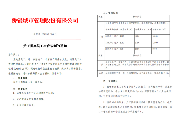 近日,一份僑銀股份新出臺的《關(guān)于提高員工生育福利的通知》流出,瞬間爆火全網(wǎng)引發(fā)熱議,網(wǎng)友紛紛大呼“神仙公司還招人嗎?”“報上地址,讓我來!”