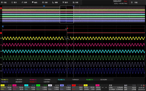 ·三相交流電分析,三相交流電廣泛應(yīng)用于需要高能效或大功率的機(jī)電設(shè)備,如三相逆變器、電機(jī)、驅(qū)動(dòng)器等。逆變器廣泛應(yīng)用于家電、太陽(yáng)能光伏發(fā)電、風(fēng)能發(fā)電等,而在諸多汽車(chē)系統(tǒng)中,主驅(qū)、水泵、油箱冷卻系統(tǒng)都是由三相電所控制,對(duì)這些設(shè)備進(jìn)行功率分析和電能質(zhì)量測(cè)量必不可少。使用SDS6000 Pro分析三相電時(shí),其中3路接高壓差分探頭測(cè)量電壓,3路接電流探頭測(cè)量電流,這樣不僅能直接觀測(cè)到實(shí)時(shí)波形,還能利用數(shù)學(xué)運(yùn)算進(jìn)行各種信號(hào)處理得到電流有效值、視在功率、波峰因數(shù)、諧波失真等參數(shù)。