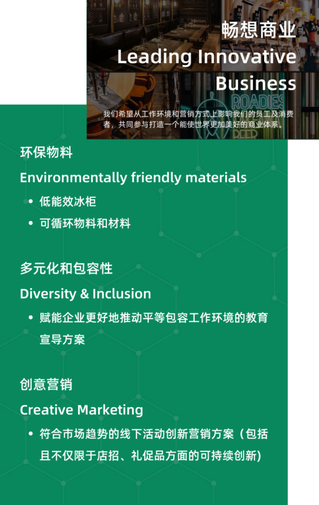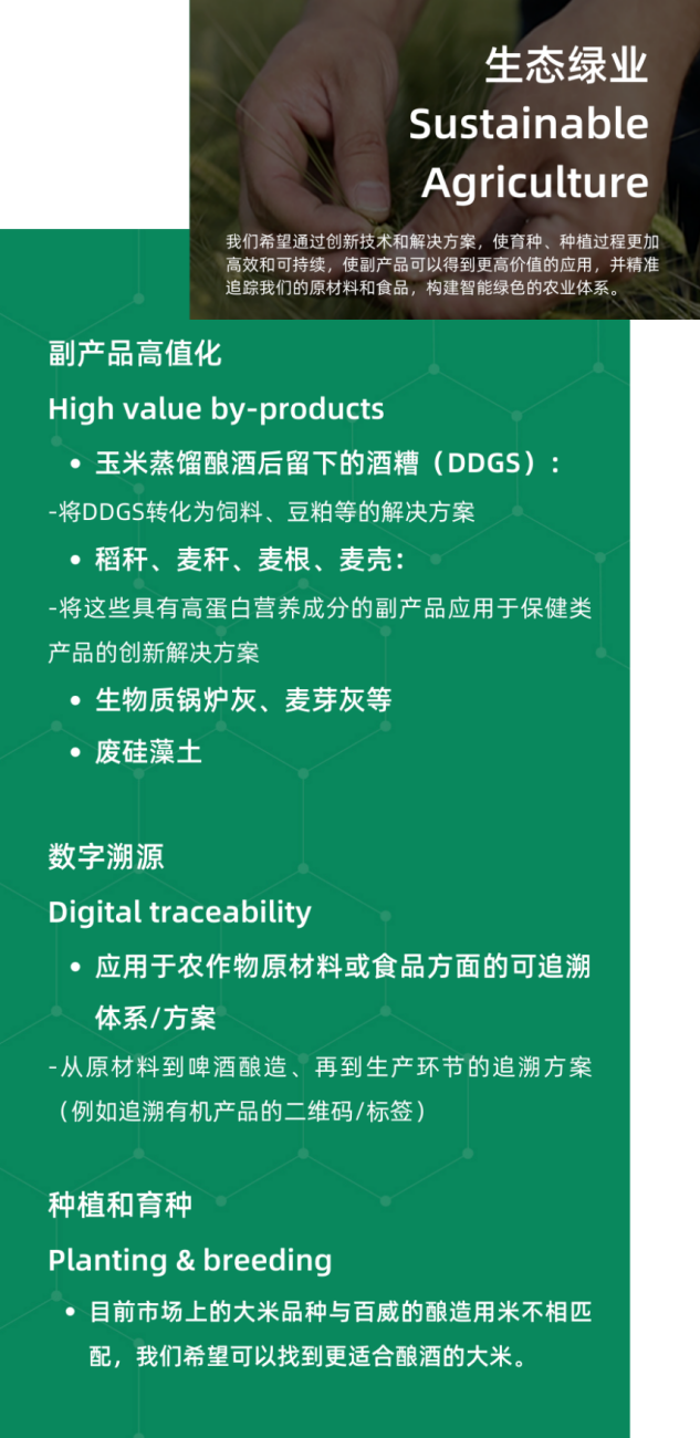 每一年,100+創(chuàng)新中心都會在價(jià)值鏈上梳理亟待解決的可持續(xù)發(fā)展挑戰(zhàn)議題并公開招募創(chuàng)新解決方案,目標(biāo)是讓你的想法得到驗(yàn)證并實(shí)現(xiàn)商業(yè)化應(yīng)用,在試點(diǎn)完成后能夠獲得更大的商業(yè)合同,與百威中國以及更多伙伴建立強(qiáng)有力的合作。