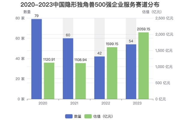 報(bào)告顯示,2023中國(guó)隱形獨(dú)角獸500強(qiáng)企業(yè)服務(wù)賽道獨(dú)角獸企業(yè)有54家,估值合計(jì)為2059.15億元(如上圖)。根據(jù)BIHU創(chuàng)業(yè)伯樂獨(dú)角獸企業(yè)數(shù)據(jù)庫(kù)(EMUDB),2021-2023中國(guó)隱形獨(dú)角獸500強(qiáng)企業(yè)服務(wù)賽道隱形獨(dú)角獸企業(yè)同比分別減少19家、減少18家、增加12家;企業(yè)服務(wù)賽道隱形獨(dú)角獸企業(yè)估值合計(jì)同比分別降低1.07%、增長(zhǎng)44.21%、增長(zhǎng)28.77%。2023年與2022年相比,企業(yè)服務(wù)賽道隱形獨(dú)角獸企業(yè)從42家上漲到54家,增加了12家,漲幅為28.57%,呈現(xiàn)出上升趨勢(shì);估值合計(jì)從1599.15億元上漲到2059.15億元,增長(zhǎng)了460億元,漲幅為28.77%,呈現(xiàn)出上升趨勢(shì)。