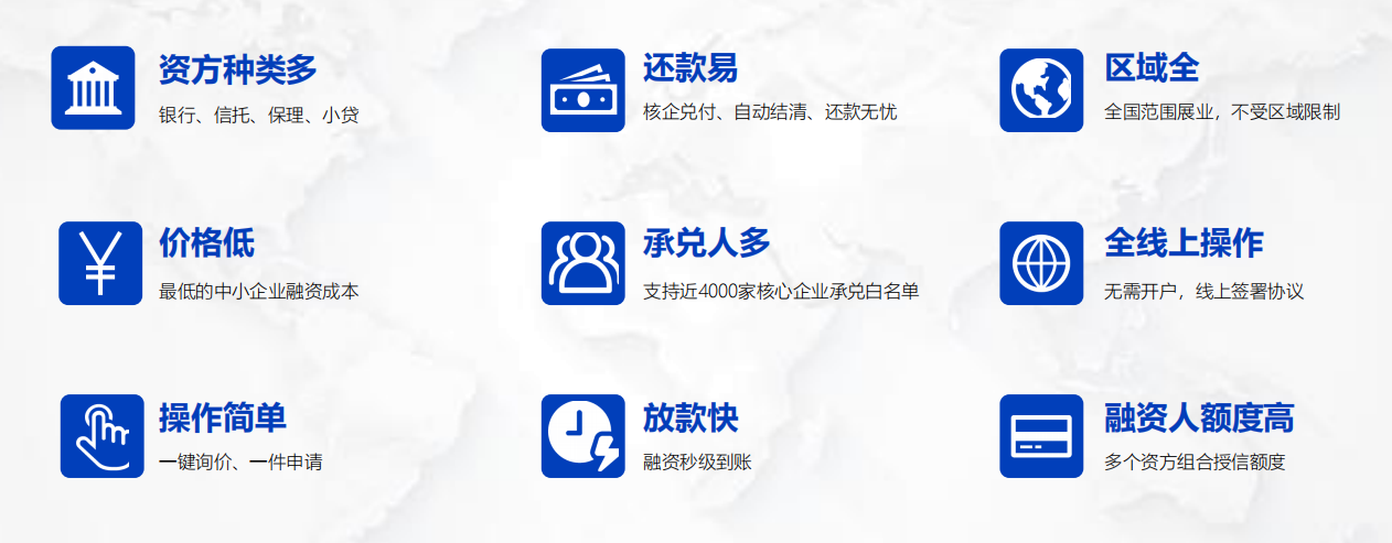 3、融資額度高、到期還款易 :融資人享受多個(gè)資方組合授信額度,核心企業(yè)兌付,到期自動(dòng)結(jié)清、還款無憂。
