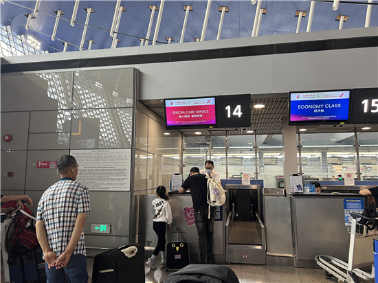 暑運(yùn)期間客流上升,東航充分發(fā)揮上海虹橋、浦東兩場(chǎng)候機(jī)樓國(guó)內(nèi)、國(guó)際值機(jī)區(qū)自助值機(jī)設(shè)備和自助行李托運(yùn)設(shè)備作用,在客流高峰時(shí)段,對(duì)排長(zhǎng)隊(duì)的旅客進(jìn)行分流。