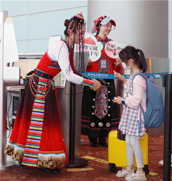 首航當(dāng)天,東航工作人員身著少數(shù)民族服裝,用親切的民族方言向旅客問(wèn)好,引導(dǎo)旅客辦理乘機(jī)手續(xù)。主題航班專(zhuān)屬柜臺(tái)前,頗有云南歷史文化元素的海報(bào)引得旅客駐足觀看,“媽媽,這是我們?cè)谖麟p版納看到過(guò)的孔雀嗎?”“哇,你看,這是大鵬金翅鳥(niǎo),我在云南省博物館見(jiàn)到過(guò)?!毙÷每蛷霓k理值機(jī)就開(kāi)始期待這趟精彩的空中博物館之旅。
