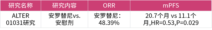 ALTER 01031的Ⅱ期隨機(jī)對(duì)照研究的結(jié)果表明,對(duì)比安慰劑,安羅替尼組的客觀緩解率(ORR)達(dá)到48.39%,可以顯著延長中位無進(jìn)展生存期(mPFS)達(dá)9.6個(gè)月(20.7個(gè)月 vs. 11.1個(gè)月)[8],為晚期MTC患者帶來顯著的PFS及ORR獲益,并且安全性良好。安羅替尼甲狀腺髓樣癌適應(yīng)癥的獲批,打破了國內(nèi)甲狀腺髓樣癌無靶向藥可用的局面,給患者帶來新希望。