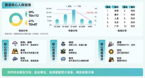 帳篷賽道解讀:該賽道抖音2022年搜索量同比增長228.6%,遠高于行業(yè)整體水平。該賽道的興趣群體以 31-40 歲的男性為主,主要分布地區(qū)涵蓋多個熱門旅游城市。隨著生活水平的提高和對自然休閑需求的增加,多功能帳篷在未來將更受歡迎,防雨、美觀和防風等多重特性將滿足人們對于舒適和便利的需求。除此之外,在技術創(chuàng)新、多樣化產(chǎn)品、個性化定制、環(huán)??沙掷m(xù)發(fā)展等趨勢上,這一領域將有廣闊的市場前景。