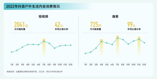 2022年戶外生活相關內容在抖音上的受歡迎程度持續(xù)增長,月均播放量高達 2041 億次,同比增長 42%。除短視頻種草外,用戶主動搜索戶外生活內容的意愿也更加強烈,月均搜索量達到 725 萬次,同比增長 99%。