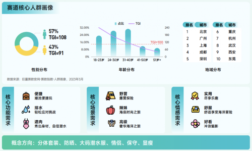 沖浪賽道解讀:2022年搜索量同比增長100.7% 。用戶以男性為主,集中在北上廣一線城市。24-40 歲人群對沖浪潛水更感興趣。相對來說,對于沖浪潛水用戶更注重便捷、排水等功能。未來,隨著技術的發(fā)展和人們對海洋環(huán)境保護意識的增強,沖浪運動將更加注重舒適、安全和環(huán)保,并可能推出更具創(chuàng)新性的裝備,產(chǎn)生新的活動形式。