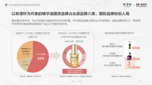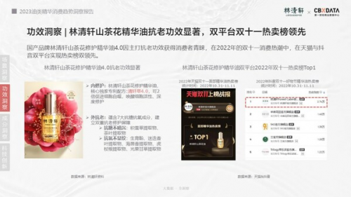 根據(jù)第一財經(jīng)商業(yè)數(shù)據(jù)中心的發(fā)布《2023油類精華消費趨勢洞察報告》 中指出,精華油、以油養(yǎng)膚,以及"抗老精華油"的概念在小紅書、抖音等社交平臺的搜索指數(shù)不斷攀升,小紅書上"以油養(yǎng)膚"話題的瀏覽總量超過了1.2億,過去一年線上淘寶天貓及京東平臺精華油銷售額同比增速達64%。在國內外品牌紛紛跟進推出油類護膚產(chǎn)品之際,林清軒憑借山茶花油的提前布局,借勢快速進入爆發(fā)期。