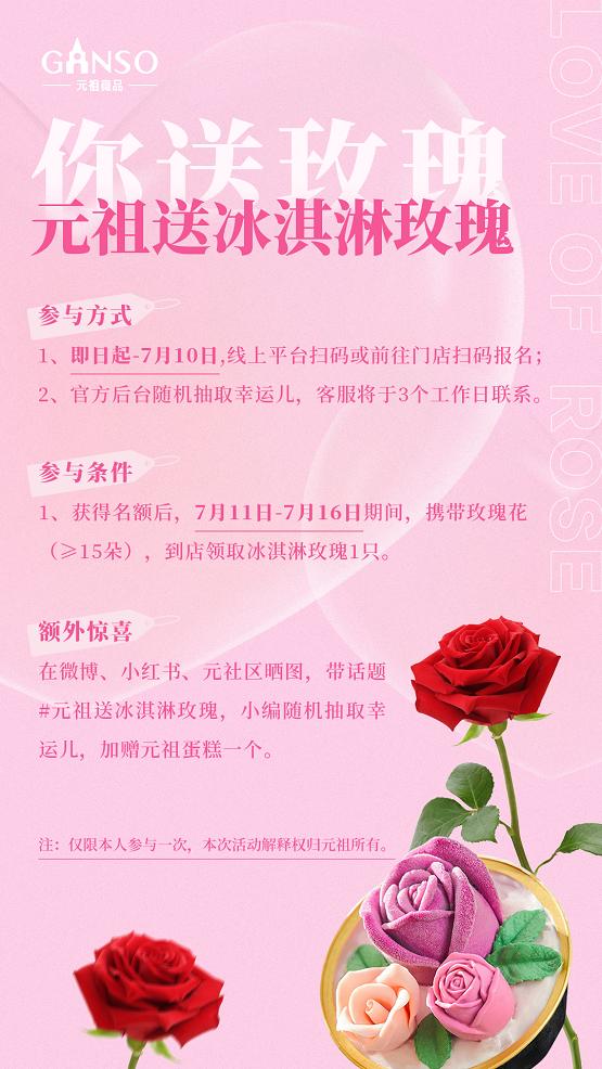 即日起至7月10日,線上平臺(tái)掃碼或前往元祖門(mén)店掃碼報(bào)名即可參與。官方后臺(tái)會(huì)隨機(jī)抽取幸運(yùn)兒,獲得名額后7月11日-7月16日攜玫瑰花到店領(lǐng)取冰淇淋玫瑰,為愛(ài)人獻(xiàn)上夏日專屬的甜蜜美味。參與活動(dòng)后,在微博、小紅書(shū)、元社區(qū)曬圖,帶話題#元祖送冰淇淋玫瑰#,還有機(jī)會(huì)獲得元祖蛋糕一個(gè)。