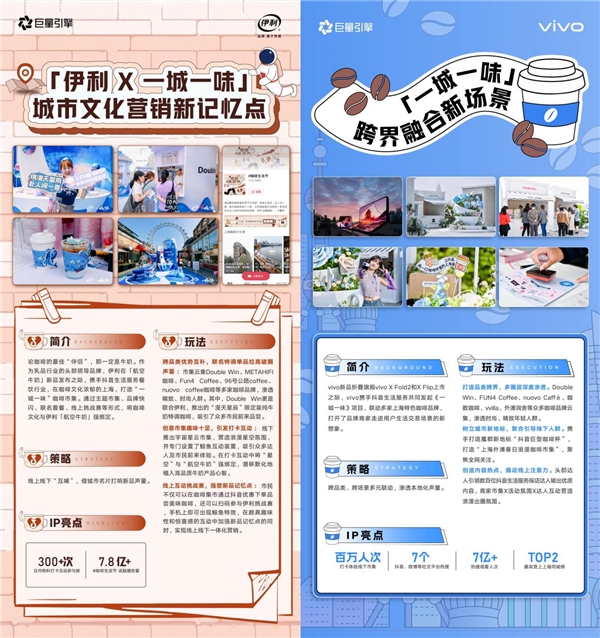 在垂類營銷層面,抖音生活服務(wù)打造《一城一味》IP,分別聯(lián)合vivo、伊利開展跨界營銷,借由上海咖啡文化周及“咖啡市”的城市文化名片,通過線上種草、線下聚合客流打卡體驗(yàn)的方式,將品牌新品融入用戶高頻生活場景,有力強(qiáng)化上海本地消費(fèi)者對(duì)新品的認(rèn)知。