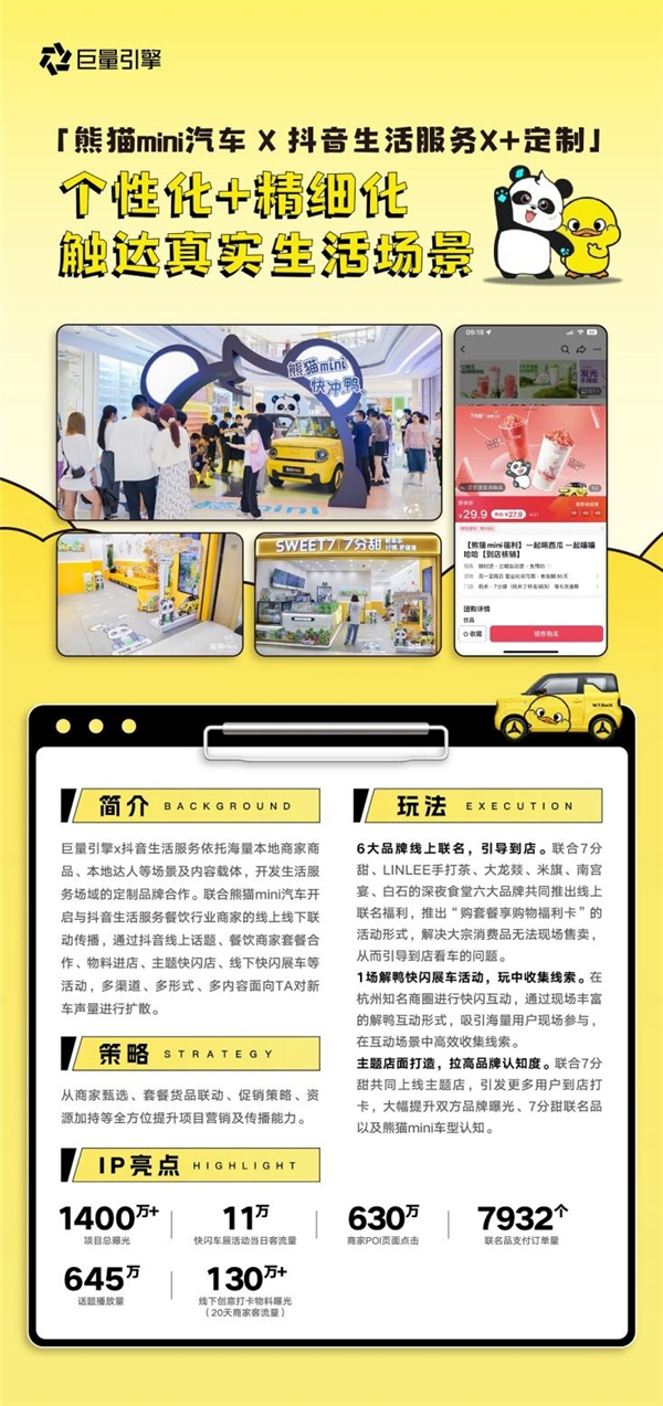 針對(duì)線索獲取成本高、轉(zhuǎn)化鏈路長等痛點(diǎn),抖音生活服務(wù)聯(lián)手熊貓mini,攜手七分甜、LINLEE手打茶等六大品牌打造聯(lián)名福利,并在核銷等生活場景中植入新車,既擴(kuò)散新車聲量,又高效收集高意向線索。