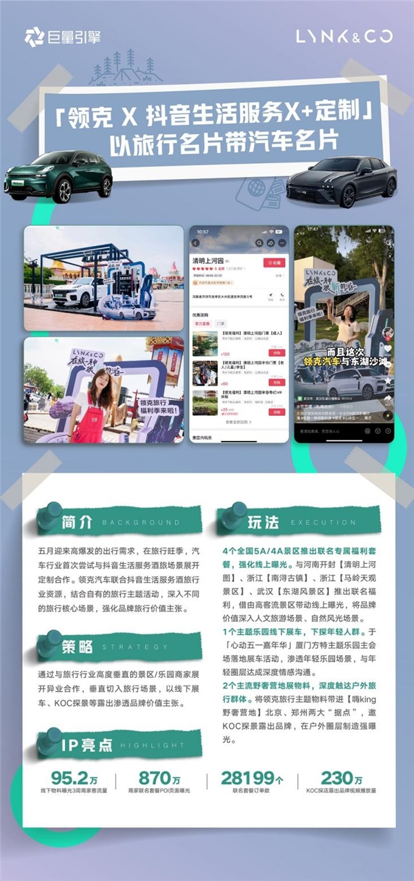 針對(duì)領(lǐng)克汽車亟需打響“旅游出行必選車”的需求,抖音生活服務(wù)酒旅商家首次與汽車客戶領(lǐng)克進(jìn)行聯(lián)動(dòng),將領(lǐng)克汽車帶進(jìn)全國景區(qū)、主題樂園、營地等旅行場景,推動(dòng)“汽車+旅游”新融合,宣揚(yáng)“領(lǐng)克汽車=旅行新選擇”品牌價(jià)值主張。