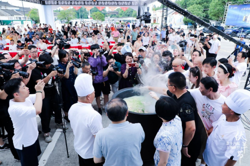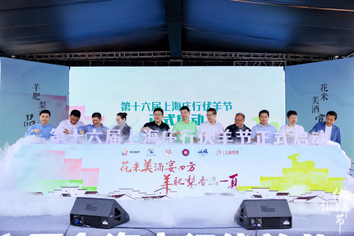 最后,奉賢區(qū)委、新民晚報(bào)、東方廣播中心、東方網(wǎng)、區(qū)融媒體中心、區(qū)文旅局、區(qū)農(nóng)委、莊行鎮(zhèn)及上海貴酒的領(lǐng)導(dǎo)共同開啟注水儀式,手持水瓶緩緩澆在寫有“第十六屆上海莊行伏羊節(jié)正式啟動”字的模具里,將開幕式的儀式感徹底拉滿。