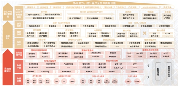 上圖為數(shù)字化經(jīng)營能力全景圖,最上層為全生命周期經(jīng)營規(guī)劃,即 AUM&MAU 雙軌經(jīng)營體系,包括不同階段的主要運營目標(biāo),如新手期主要為用卡習(xí)慣養(yǎng)成、用戶價值快速識別、新戶首面后離店經(jīng)營繼承等。