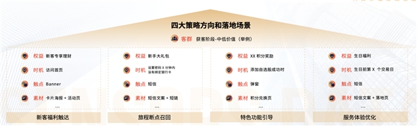 ? 業(yè)務(wù)策略:匹配業(yè)務(wù)特點和經(jīng)營目標(biāo)的經(jīng)營策略體系,不同業(yè)態(tài)的業(yè)務(wù)策略和場景不同,可嘗試創(chuàng)新的點也不同;匹配業(yè)務(wù)與客群特點的渠道定位和場景建設(shè)