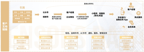金融企業(yè)在客戶全鏈路互動與經(jīng)營上,涉及到的渠道觸點也比較多。通常,在引流階段,客戶通過交易型 App、資訊類 App、種草媒體等進(jìn)行互動,之后進(jìn)入公眾號、視頻號為主的公私域轉(zhuǎn)換的形態(tài),如果轉(zhuǎn)化周期較長,還會通過客戶經(jīng)理和企業(yè)微信進(jìn)行 1V1 服務(wù)引導(dǎo)和關(guān)系維護(hù),還可以直接導(dǎo)量到小程序或 H5 進(jìn)行輕轉(zhuǎn)化,以及到手機(jī)銀行、金融業(yè)務(wù) App,結(jié)合客戶經(jīng)理、網(wǎng)點服務(wù)和會員系統(tǒng)加強(qiáng)后鏈路深度運營。