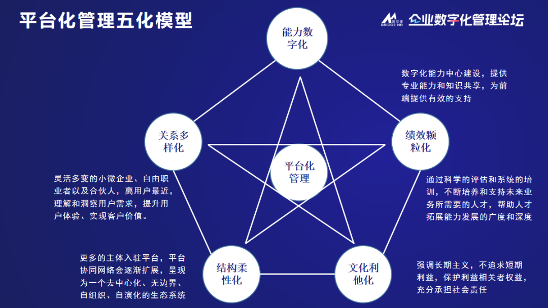5. 文化利他化:公司文化要強調(diào)堅持長期主義,不能追求短期的利益,以保護利益相關(guān)者的權(quán)益而充分地承擔(dān)社會責(zé)任。平臺化管理的文化是內(nèi)化于心,尤其是外部合伙人要幫助他。