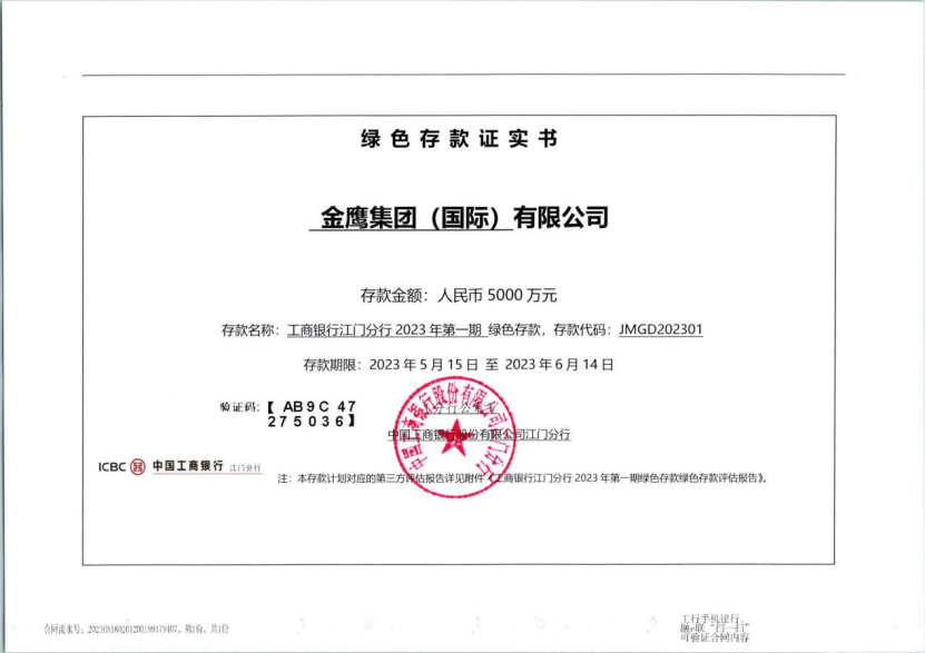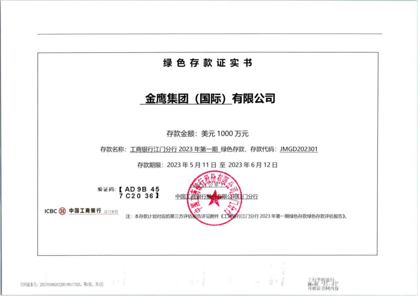 金鷹集團(tuán)綠色存款證實(shí)書