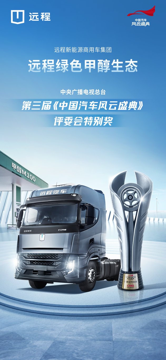 2023年4月7日,在中央廣播電視總臺主辦的第三屆《中國汽車風云盛典》頒獎典禮上,遠程綠色甲醇生態(tài)榮獲評委會特別獎,成為首個以商用車為主體的獲獎企業(yè)。