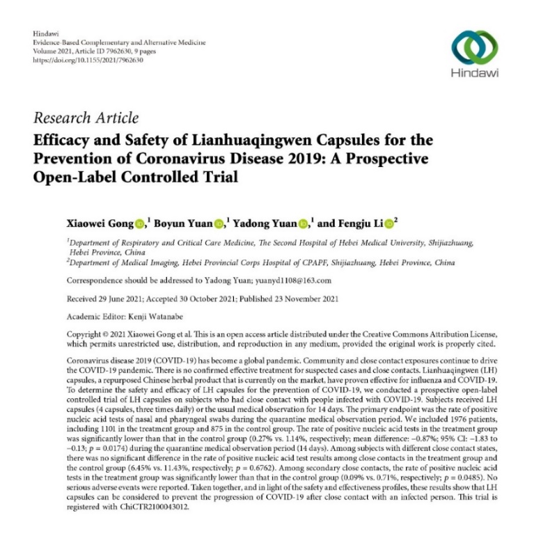 由河北醫(yī)科大學(xué)第二醫(yī)院呼吸與危重癥醫(yī)學(xué)二科主任袁雅冬教授主持開展的“連花清瘟膠囊預(yù)防新型冠狀病毒肺炎”真實(shí)世界研究論文被國際學(xué)術(shù)期刊《循證補(bǔ)充和替代醫(yī)學(xué)》刊發(fā),該研究選取1976例與新冠肺炎感染者有密切接觸的受試者,分為連花清瘟治療組(1101例)和對照組(875例),兩組受試者分別接受連花清瘟膠囊(4粒/次,3次/天)治療和常規(guī)醫(yī)學(xué)14天觀察,并于14天后檢測鼻咽拭子核酸檢測陽性率。研究結(jié)果顯示,隔離醫(yī)學(xué)觀察期間(14天)治療組核酸檢測陽性率為0.27%,對照組為1.14%;二次密切接觸者中,治療組核酸檢測陽性率為0.09%,對照組為0.71%。服用連花清瘟治療組都顯著低于對照組。在醫(yī)學(xué)隔離觀察期間,對于核酸檢測陽性患者,連花清瘟治療組的癥狀發(fā)生率顯著低于對照組,特別是能顯著降低發(fā)熱的發(fā)生率。這是首個對新冠密切接觸者預(yù)防的有效性和安全性的臨床試驗(yàn)。