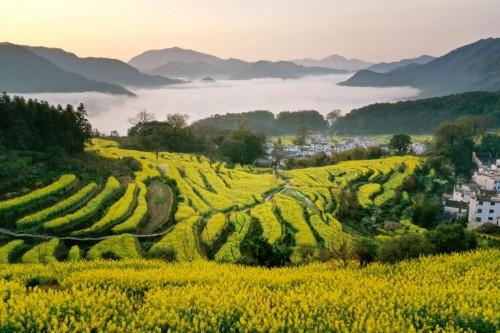 進入三月中旬以來,江西婺源的十萬多畝油菜花競相開放,正式進入了盛花期。迷人花海遍布每個村莊,風姿灼灼,景色迷人。在“中國四大花?!敝坏慕瓗X景區(qū),漫山遍野的油菜花隨著梯田彎曲的線條蜿蜒至遠方,猶如金蛇舞動,蔚為壯觀。在李坑、思溪延村等景區(qū)油菜花盛開于徽派建筑之間,與小橋、流水、人家構(gòu)成了一幅娟秀柔美的江南春景圖,引來了天南地北的游客賞花潮。