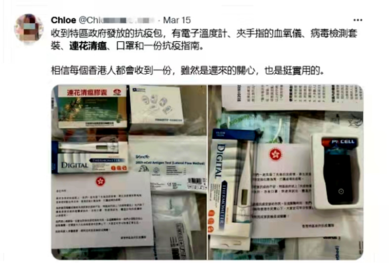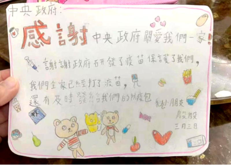 “收到特區(qū)政府發(fā)放的抗疫包,有電子溫度計(jì)、夾手指的血氧儀、病毒檢測(cè)套裝、連花清瘟膠囊、口罩和一份抗疫指南,挺實(shí)用的?!苯?#xff0c;一名居家隔離的香港居民收到政府派發(fā)的“抗疫物資包”后,在社交平臺(tái)開心的曬出圖文。更早前,一位叫殷殷的香港小朋友用自己手寫的感謝信,表達(dá)了對(duì)中央政府為香港市民提供防疫物資的感謝。隨著疫情防控的逐步深入,一個(gè)個(gè)像這樣滿載關(guān)愛的“抗疫包”越來(lái)越快地出現(xiàn)在人們手中。