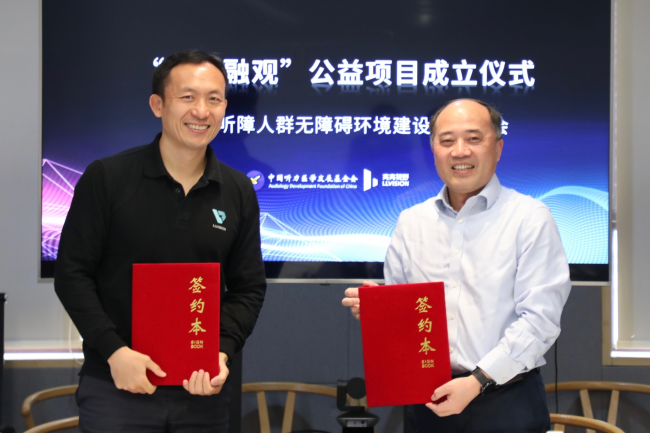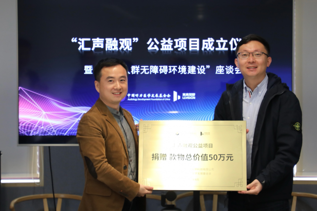中國聽力醫(yī)學(xué)發(fā)展基金會常務(wù)副理事長兼秘書長公澤忠(右)同北京亮亮視野科技有限公司首席運營官婁身強(左)共同完成公益項目的捐贈儀式
