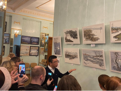 開(kāi)幕當(dāng)天,畫(huà)家劉子輿受邀走進(jìn)俄羅斯國(guó)家科學(xué)院“大師課堂”,教授俄羅斯學(xué)員創(chuàng)作中國(guó)水墨畫(huà)。學(xué)員不少是俄羅斯知名的專業(yè)油畫(huà)家。劉子輿從畫(huà)面構(gòu)圖、運(yùn)筆、調(diào)墨、調(diào)色等方面進(jìn)行深入講解,現(xiàn)場(chǎng)示范中國(guó)繪畫(huà)技巧,墨色在宣紙上產(chǎn)生濃淡變化,學(xué)員們很驚喜,非常感謝劉子輿帶領(lǐng)他們體驗(yàn)了東方藝術(shù)之美。