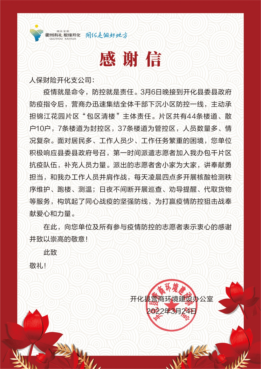 開化縣營(yíng)商環(huán)境建設(shè)辦公室為開化人保財(cái)險(xiǎn)支持抗疫送上的感謝信。
