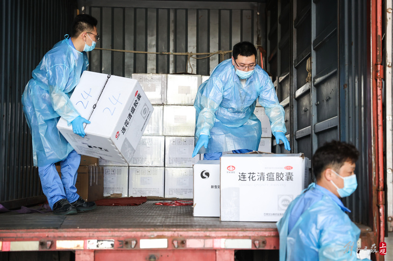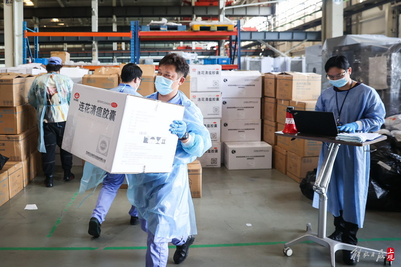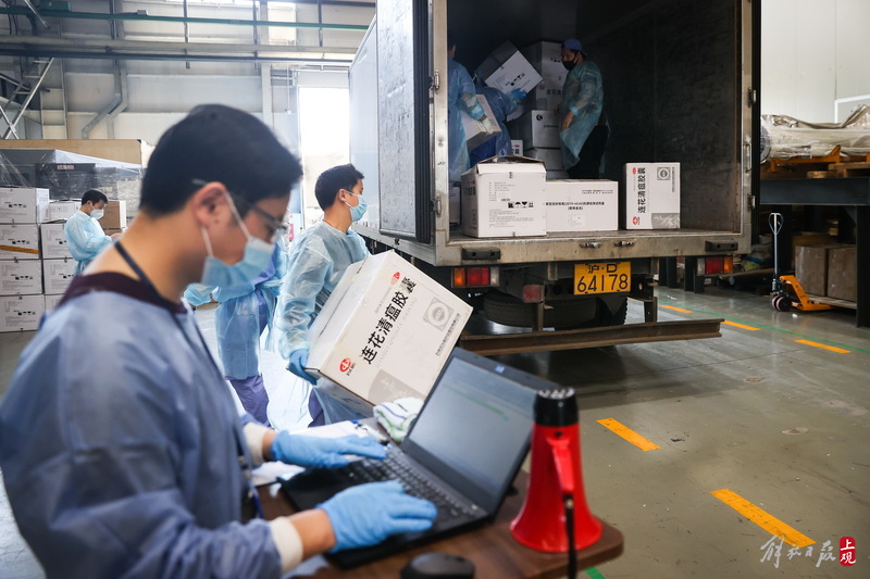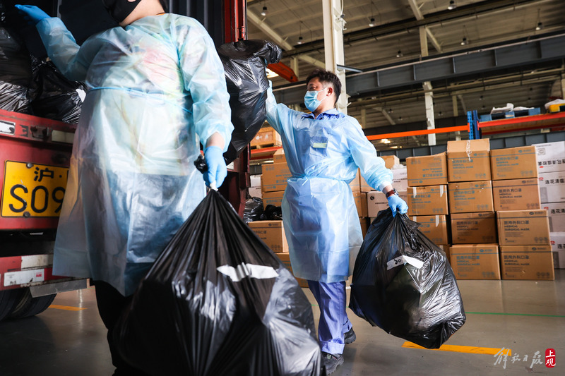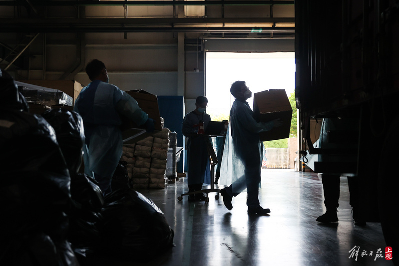 為不增加基層負(fù)擔(dān),寶山區(qū)啟用7個分揀點對應(yīng)13個街鎮(zhèn)園區(qū),由招募來的企業(yè)職工及志愿者流水線作業(yè),對物資開展卸貨、分裝。