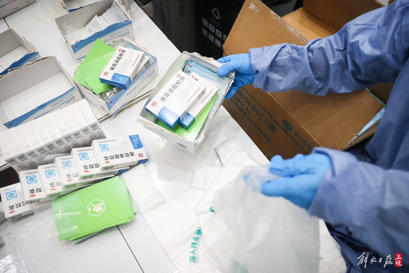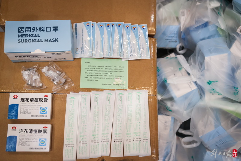 每個服務(wù)包內(nèi)有口罩、連花清瘟膠囊、抗原測試盒,并附有一張上海市疫情防控工作領(lǐng)導(dǎo)小組辦公室的心意卡。