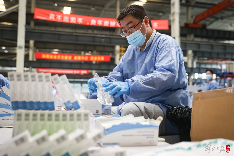 2022年4月11日,上觀新聞記者來到業(yè)績路上的寶山防疫服務(wù)包最大的分裝車間,這里原本是上海漢虹精密機(jī)械有限公司的生產(chǎn)廠房,但該廠百余名志愿者從早上八點就開始分批次投入到了防疫物資的分裝“流水線”作業(yè)中,一張張清單核對,一件件物資分裝,現(xiàn)場熱火朝天。