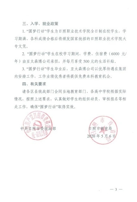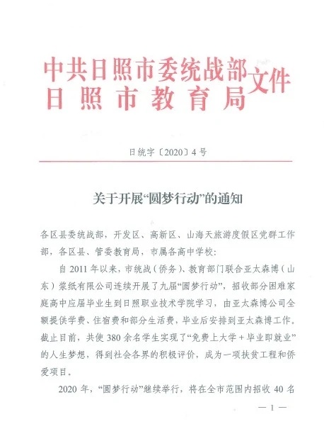 2011年,亞太森博與統(tǒng)戰(zhàn)部門合作開展的“圓夢行動”正式啟動。亞太森博出資,統(tǒng)戰(zhàn)協(xié)調(diào)教育部門出政策,與大學合作,為考上大學的家庭貧困高中生解決學費、生活費,圓夢大學。