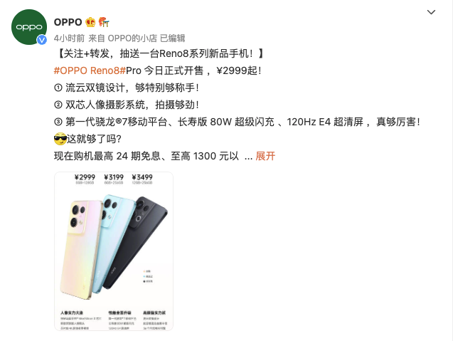 目前,OPPO Reno8 Pro已經(jīng)正式開(kāi)售,8+128GB版2999元、8+256GB版3199元、12+256GB版3499元,OPPO商城、天貓、京東等線上和OPPO線下門店均有現(xiàn)貨銷售,感興趣的可以了解一下。