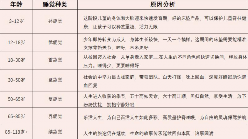 據(jù)了解,這8種覺囊括從新生到暮年的8個(gè)階段,每個(gè)階段根據(jù)人的身體發(fā)育需求、身體特征,結(jié)合所處年齡階段、社會(huì)環(huán)境等因素,來選擇不同的床墊,進(jìn)而滿足人在每個(gè)階段好好睡覺的需求。