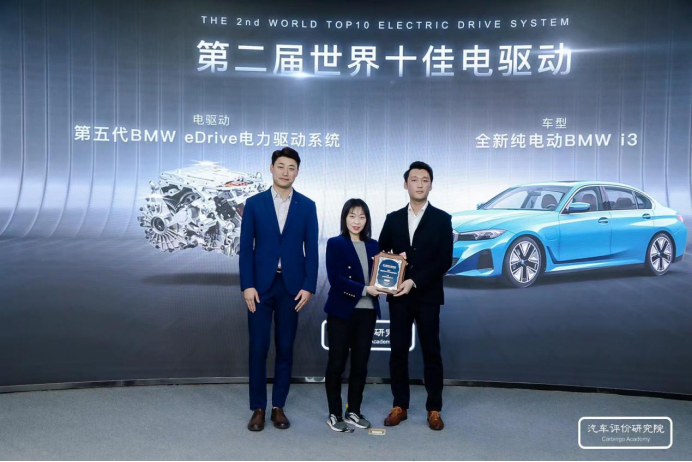 世界十佳動(dòng)力系統(tǒng)評(píng)委會(huì)秘書長(zhǎng)孫浩然、汽車評(píng)價(jià)研究院副院長(zhǎng)李鏑鋒為BMW企業(yè)代表頒獎(jiǎng)