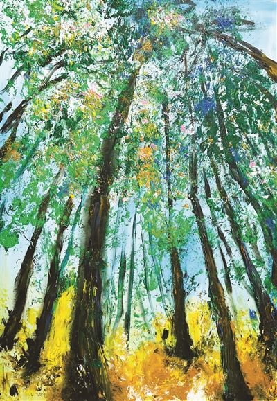 吳冠中老先生曾說,中國畫不能“近親結婚”。因為我們的視野狹窄。藝術是相通的,不分東方和西方。因此,劉家男不斷吸收東西方精華,并運用于作品之中。她的作品既能呈現(xiàn)出西方作品的色彩美感,同時又兼具中國潑墨的畫面呈現(xiàn)。無論是胡楊林系列,還是天端系列、鯨落系列以及自然系列,其作品的整體色彩都是非常大膽的,給人以強烈的視覺沖擊。劉家男認為,這是一個藝術家應有的標志性符號。