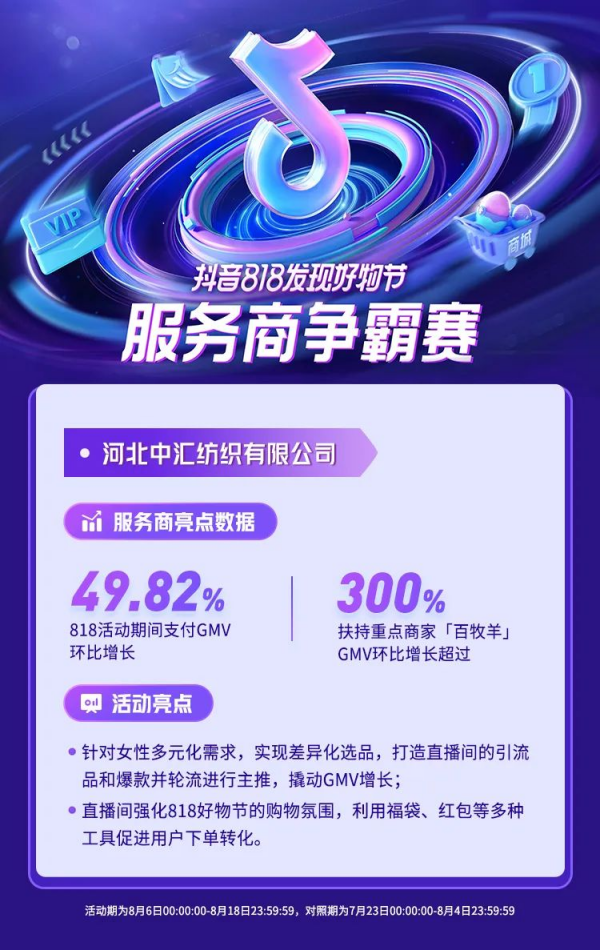 河北中匯紡織有限公司在其所服務的女裝直播間,深挖女性消費個性需求,選出小眾的產(chǎn)品,打造兼具引流品和爆品的貨盤;與此同時,渲染818氛圍,利用多種玩法(如福袋、紅包等),結(jié)合主播引導,促進粉絲下單?;顒悠?#xff0c;支付GMV環(huán)比增長49.82%。
