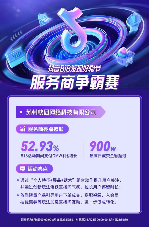 在直播間,蘇州快團網(wǎng)絡科技有限公司,利用人設特質(zhì)配合爆品、話術(shù),引導消費者在評論區(qū)扣彈幕,提升互動率;同時,依靠關(guān)注和燈牌,提升直播間的自然流量;通過優(yōu)質(zhì)限量產(chǎn)品,引導用戶下單成交;進而,搭配福袋、入會員抽優(yōu)惠券等玩法加強直播間互動,促成下單。8月活動中,服務商家的結(jié)算GMV環(huán)比增長52.93%。