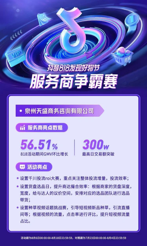 面向成長中的產(chǎn)業(yè)帶服務商,本次抖音818服務商活動,平臺還帶來了服務商排位賽玩法,為服務商給予榮譽排名和宣發(fā)傳播激勵。
