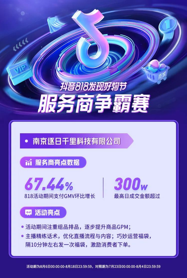 南京逐日千里科技有限公司在活動期間幫助商家圍繞大促玩法,重新組品排品,逐步提升商品GPM;精煉直播流程的同時,巧妙運營福袋,隔10分鐘左右發(fā)一次福袋,激勵消費者下單,活動期,幫助商家最高日成交金額超過300萬。