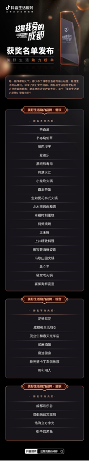 2022年11月4日,由抖音生活服務(wù)發(fā)起的「這是我愛的成都」助商惠民計(jì)劃收官大賞,以一場(chǎng)「這是我愛的成都·美好生活助力榜單」榮譽(yù)發(fā)布,對(duì)活動(dòng)期間為成都播撒生活美好的30個(gè)品牌和10位達(dá)人做出總結(jié)與嘉獎(jiǎng)。