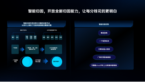 其中一個(gè)新的亮點(diǎn)是智能歸因能力升級(jí)。智能歸因作為不依賴于設(shè)備ID的系統(tǒng)級(jí)服務(wù),在把握APP不同生命周期的基礎(chǔ)上結(jié)合用戶生命周期特點(diǎn),以vivo全域效果優(yōu)化視角為客戶提供生態(tài)全域增長服務(wù),呈現(xiàn)更全面的用戶行為鏈路,共創(chuàng)更多營銷可能性。