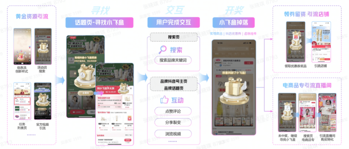 春日營(yíng)銷期間,“小飛盒”的驚喜禮遇玩法非常應(yīng)景。作為巨量引擎首個(gè)引導(dǎo)用戶搜索行為的彩蛋互動(dòng)產(chǎn)品,小飛盒能夠確定性提升品牌搜索量,加速用戶關(guān)系流轉(zhuǎn)。當(dāng)用戶在搜索、話題、信息流等場(chǎng)域觸發(fā)小飛盒后,搭配春意、愛(ài)意氛圍的禮盒就會(huì)“從天而降。利用獎(jiǎng)品派發(fā)的方式,激勵(lì)用戶去搜索品牌關(guān)鍵詞。通過(guò)這種互動(dòng)方式,小飛盒可以快速把興趣用戶轉(zhuǎn)化為種草用戶,再結(jié)合搜索品專、抖店優(yōu)惠券,引導(dǎo)用戶完成消費(fèi)轉(zhuǎn)化,高效串聯(lián)種收全鏈。